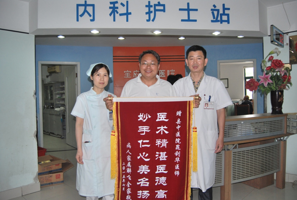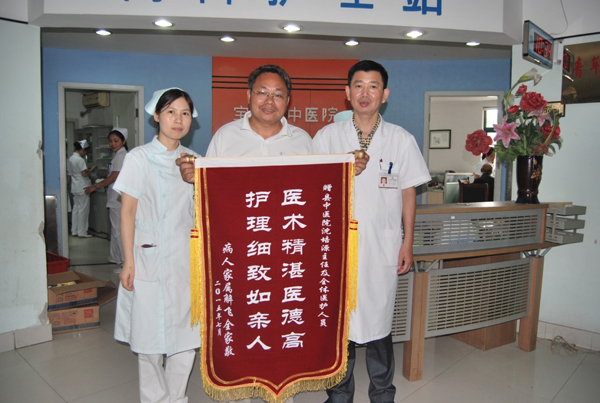 7月21日上午,家住城区的杨奶奶家属特地给我院二病区沈培源主任和全体医护人员及晁利华医师个人送来锦旗。