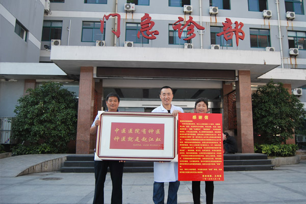 最近,安宜镇居民王寿富夫妇很激动的到中医院,送来感谢信和“神医”牌匾。王寿富在感谢信中讲述了他夫人身患怪病二十余年。这期间跑遍上海,南京,东北等许多大医院,去年在上海查出患有鼻窦炎,但是治疗没有任何效果,又继续找名医,访专家,均未能查出病根所在。今年大伏天来临,夫人病情有加重趋势,心中非常焦急,准备到中医院找专家开些中药调理,看到赵江虹医生科室门口专家介绍,在治疗鼻窦炎方面有一套。于是向从未谋面的赵江虹医生咨询鼻窦炎怎么医治才有效果,赵医生相当热情的接诊,查看了所有检查报告后,很果断的说,你夫人的病根,不在鼻窦炎上,很可能是”混合型结缔组织症和干燥综合症“,然后搭脉看舌苔,通过化验报告结果更加确定他的诊断是对的。他们仍将信将疑,立即赶到上海市长海医院做进一步检查,证实了和赵江虹医生的诊断是一致的。经过这几个月的对症治疗,已经控制住病情并逐步好转。他们对赵江虹医生认真负责的精神,非常感动,几次表示感谢都被拒绝,赵江虹医生说:对病人负责,为患者服务,是我们的责任,应当的。他们对赵江虹医生崇高的医德和高超的诊断技术由衷感谢和佩服,他们称:赵江虹医生真是中医院的“神医” 啊!为此,写了感谢信,并请朋友制作“神医”牌匾,对中医院和赵江虹医生表示赞扬。