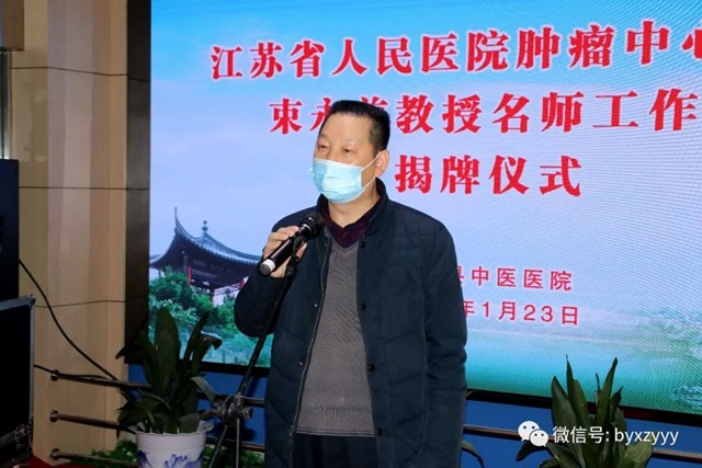 江苏省人民医院肿瘤中心主任束永前教授、党政综合办主任陈涛、肿瘤科副主任朱陵君、县卫健委副主任沈新华、我院院长李国柱、院党支部书记王心亚、常务副院长许景亮、行政副院长仲卫东等院领导班子成员及干部职工代表出席揭牌仪式。